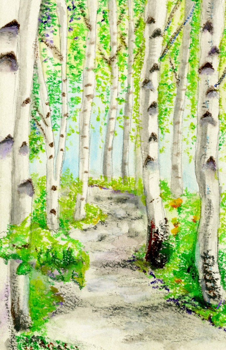 Blend the oil pastels with the water brush to mix colours and form gradients.